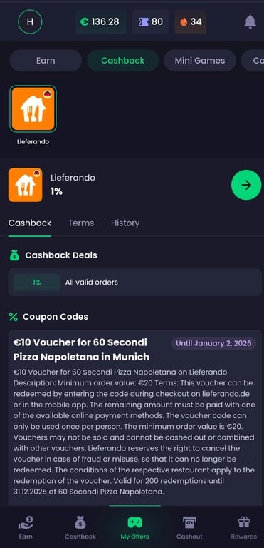 I Mine Tilbud-sektionen skal du skifte til Cashback-fanen. Gennemse din liste over cashback-tilbud, find det specifikke tilbud, du har problemer med, og åbn det for at se flere detaljer.