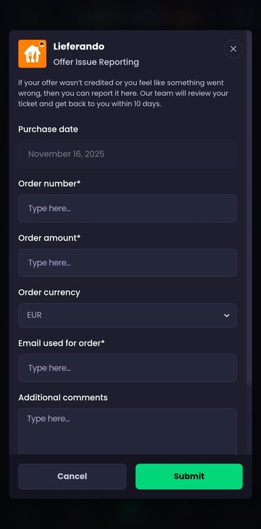 For at vores team kan begynde at undersøge sagen, skal du følge linket i e-mailen for at bekræfte din henvendelse, og hvis nødvendigt, uploade relevante dokumenter som dokumentation. Dette kan omfatte skærmbilleder, bevis for gennemførelse, bekræftelses-e-mails eller anden dokumentation relateret til cashback-tilbuddet.