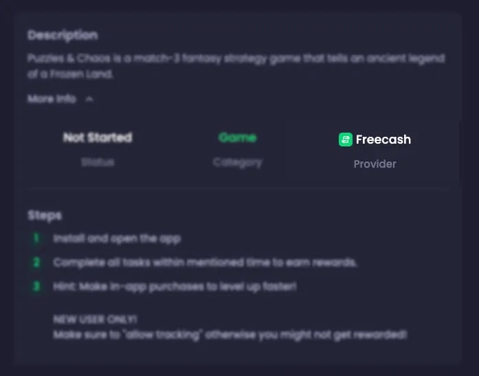 - Find tilbuddet fra partnersektionen på Tjen-siden, eller gå til din Freecash profilside, og vælg det ukrediterede tilbud fra "Indtjening i gang"-sektionen.