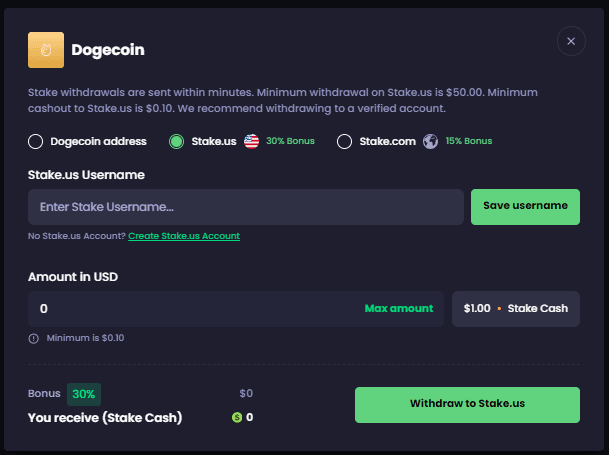 - Dogecoin bliver indsat direkte på din Stake.com-konto.