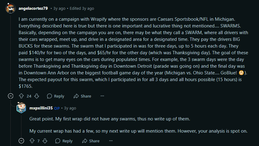 Wrapify hat die besten Bewertungen und einen Background, der sie vertrauenswürdig und legitim macht. Allerdings gibt's da einige Haken und Anforderungen, damit du wirklich Geld mit Autowerbung verdienen kannst, wie zum Beispiel Autotreffen mit anderen, um gemeinsam zu werben (laut diesem Reddit-User werden die "SWARMS" genannt).