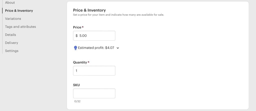 Wenn du die Preise für deine Produkte festlegst, denk darüber nach, wie lange die Herstellung gedauert hat und was die Materialien gekostet haben. Es ist ein kluger Schachzug, ähnliche Artikel in deiner Nische auf Etsy zu checken, um ein Gefühl für die gängigen Preise zu bekommen und dein Produkt wettbewerbsfähig zu gestalten. Du kannst auch Etsys Gebühren und Versandkosten bei der Preisgestaltung berücksichtigen. Je nachdem, wie viele Verkäufe du machst, kannst du den Preis später anpassen.