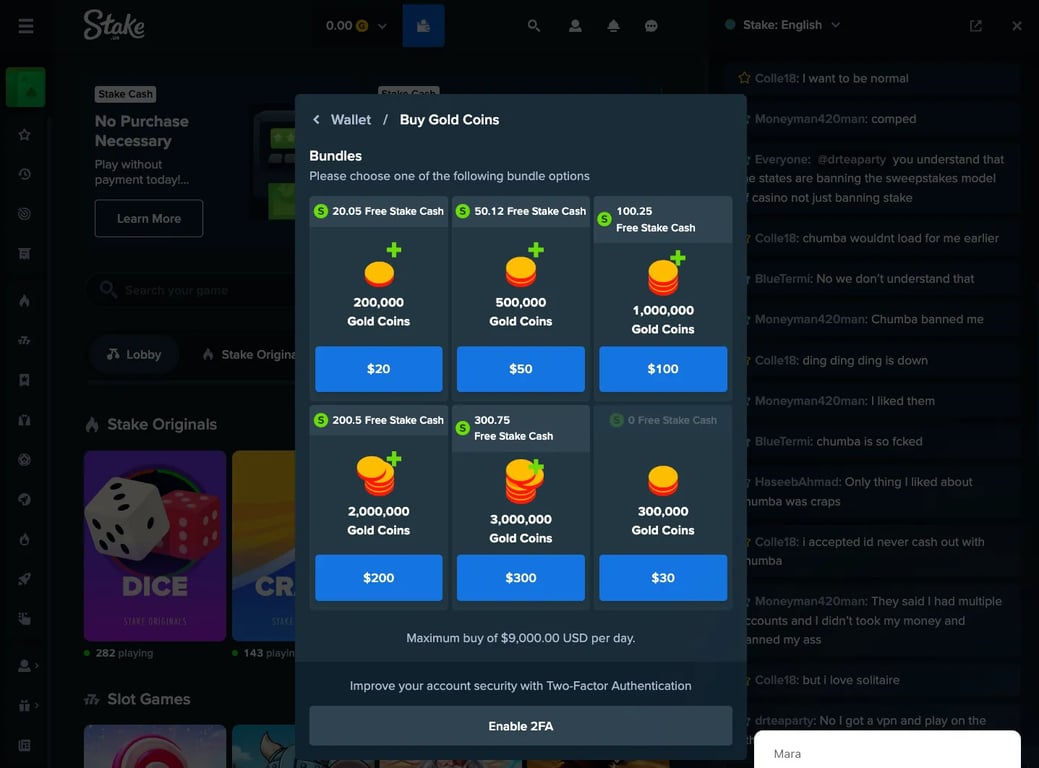 Sobald du dein erstes Gold Coin Paket auf Stake.us kaufst, das ab 20€ erhältlich ist, bekommst du eine Belohnung von 20€ auf dein Freecash-Konto. Vorausgesetzt natürlich, du hast dich über das Freecash-Angebot beim Casino angemeldet.