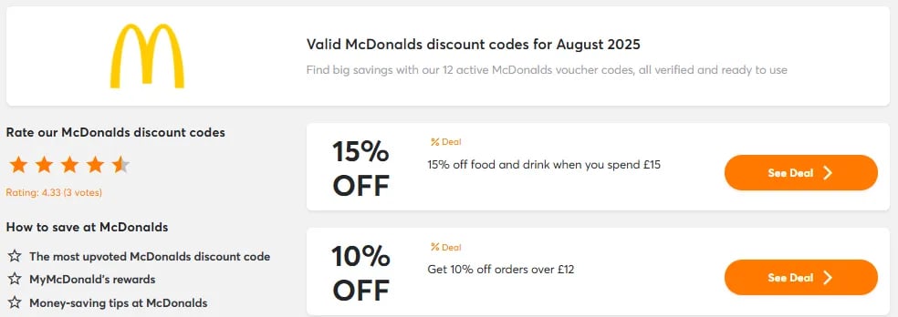 For older audiences not using the app, McDonald's still provide lots of discount codes, which they advertise in local newspapers and magazines. They aren't as extreme as promos, normally just one-off deals like a cheap Big Mac, but it's worth looking for discount codes in your area before visiting McDonald's.Â