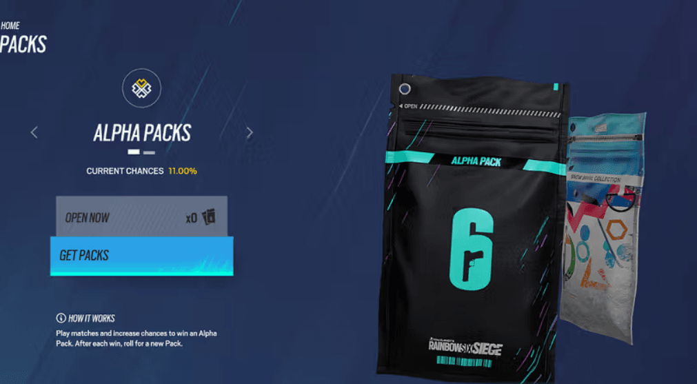 - Play the Game. To earn R6, players have a roulette to spin at the end of each match. If the pointer ends on a percentage, the player has earned an Alpha pack. However the more you play, the percentage doubles as you finish quick matches. This increases your odds of winning an Alpha pack.