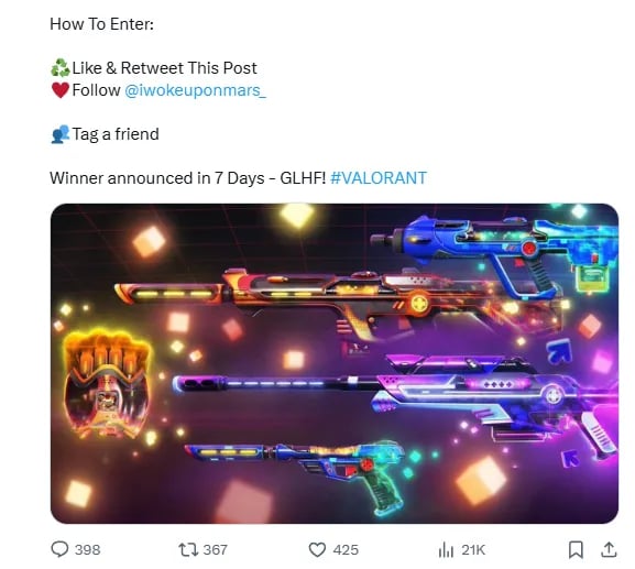 While Riot Games itself rarely hosts official giveaways anymore, many Valorant content creators and fan-run social media channels often do. They use these giveaways to grow their audience, and the prizes are often Valorant Points or gift cards: