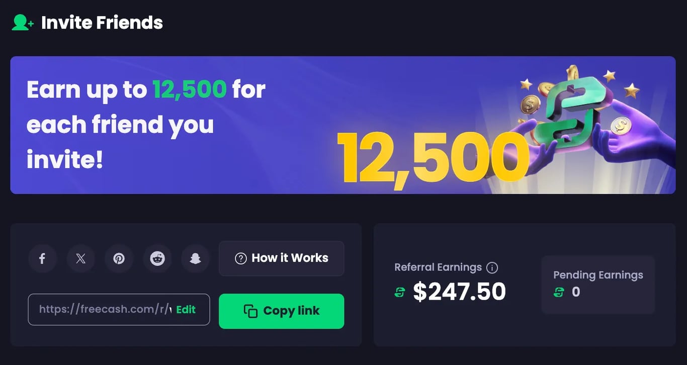 Every user has a unique sign-up link, and if someone signs up to Freecash using your link...