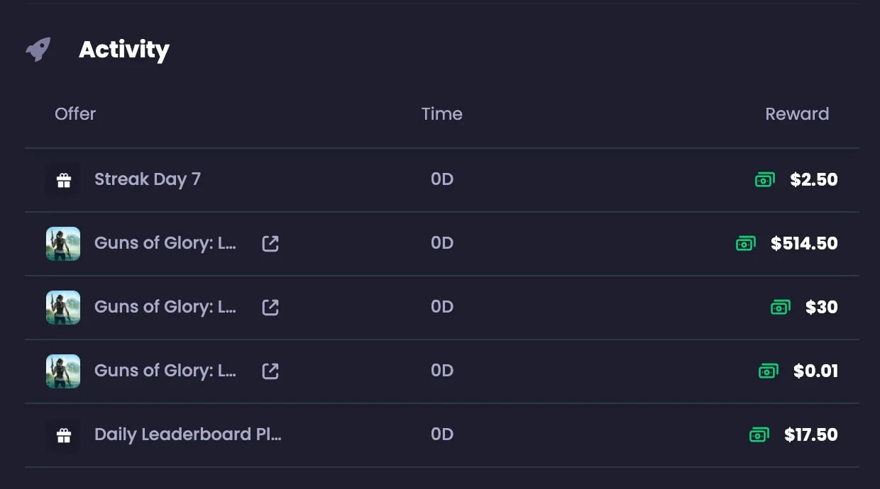 Brad is from Alaska, which can be at times a lonely place due to its distance from the great US territory. However, Freecash has offered Brad an opportunity to not only make money from playing his favorite games like Guns of Glory: Lost Island (like shown from his activity below), but also connected him to a whole community that supported him since the beginning.