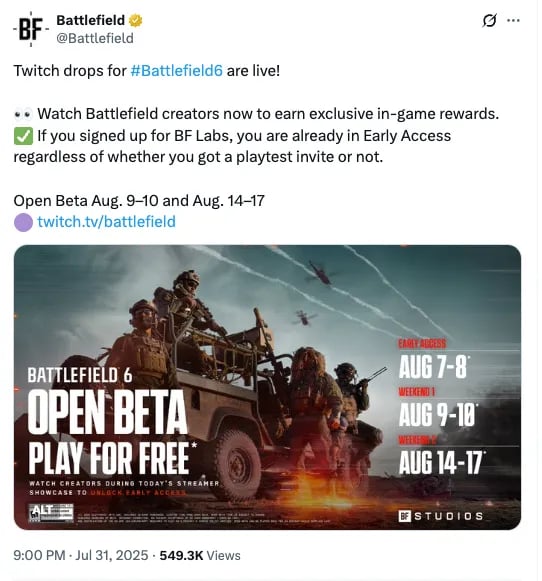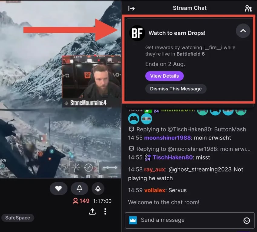 - Follow @Battlefield on Twitter, this is where you'll see official announcements when Twitch Drops go live.