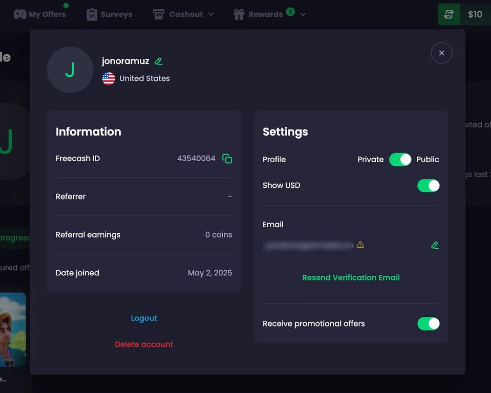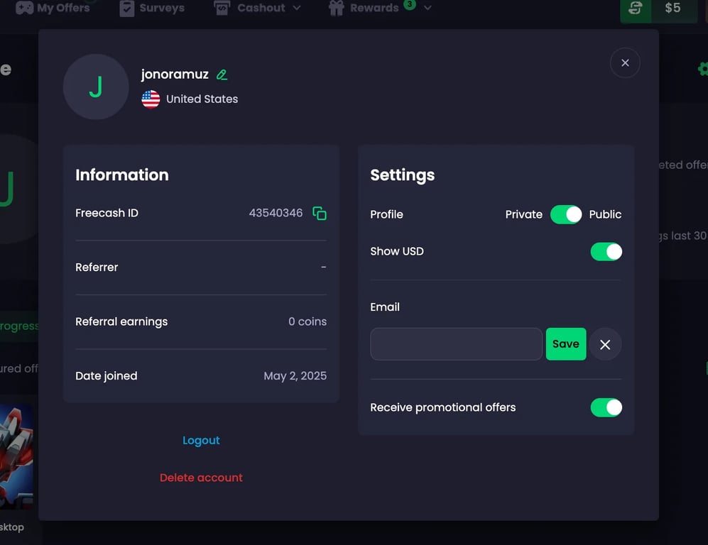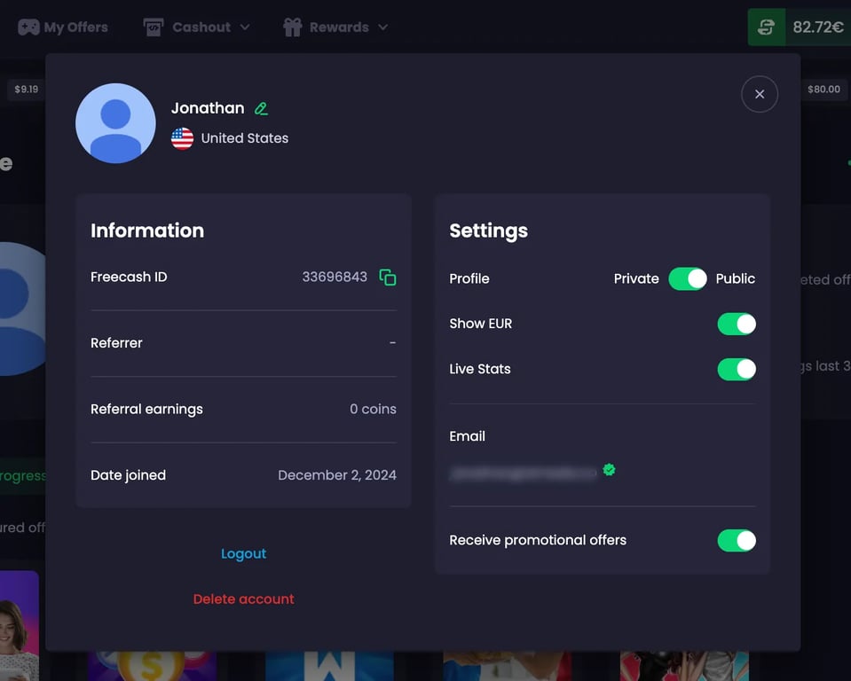 - Go to your Freecash Profile, which can be done by clicking on your avatar.