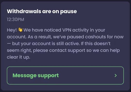 If you see a notification like the one below, we have temporarily disabled cashouts for your account.