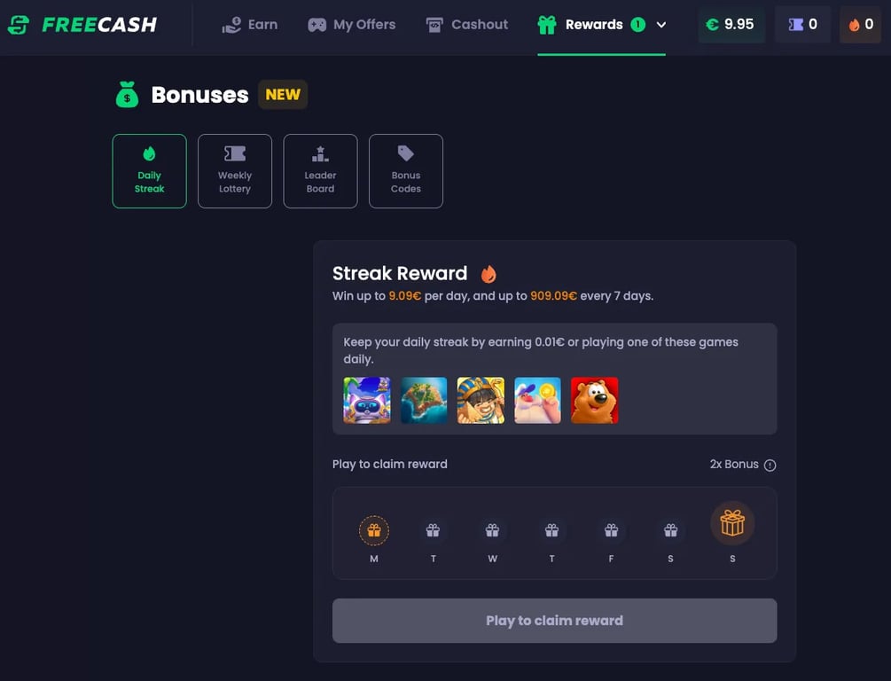 Streak Rewards are unlocked whenever you log into Freecash and earn at least 10 Coins for multiple days in a row. Each day you log in during a streak, you unlock either a reward case or lottery tickets.