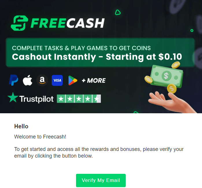 When you first sign up for Freecash, the system will automatically send an email to the email address you provided. The email Subject will be Action Required: Confirm Your Freecash Email.