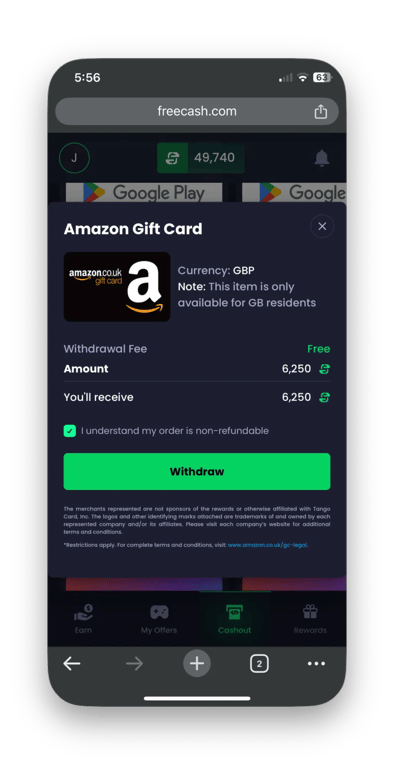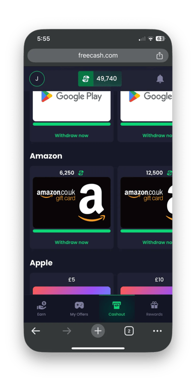 On the Cashout page, you will find Amazon gift cards, starting from as low as $5. Select the Amazon gift card amount you would like to withdraw.