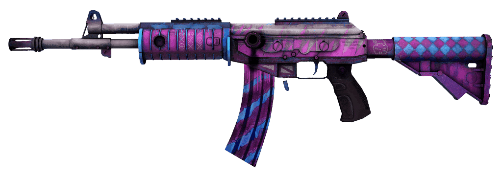 Il fucile mitragliatore presenta una verniciatura accattivante in tonalità rosa e blu con un design a scacchi e un'immagine bianca della testa di un coniglio sul calcio. Il caricatore ha strisce diagonali rosa e blu, e un giocoso disegno di "tris" è sul paramano. L'impugnatura è di un solido color bordeaux.