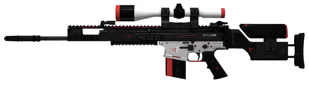 Il design della skin adotta uno stile futuristico, con il corpo principale del fucile rivestito in elegante nero. Una vernice bianca adorna il mirino e la parte superiore della cassa, appena sopra il caricatore. A completare il design ci sono accenti accattivanti sotto forma di vivaci strisce rosse e pittogrammi triangolari che colpiscono l'occhio.