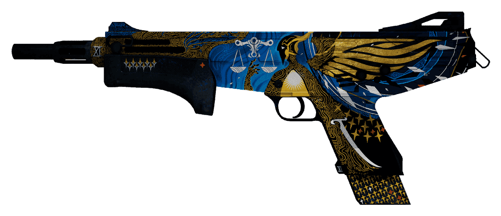 Ispirata alla carta dei tarocchi "L'Imperatrice", questa particolare skin mostra una ragazza bionda incoronata, avvolta da raggi di sole. Il paramano, il calcio e l'impugnatura sono elegantemente dipinti in una gamma di affascinanti tonalità blu, accompagnati da simboli intricati e dettagli ornamentali strettamente legati al simbolismo della carta. Ad aumentare il suo fascino, il caricatore vanta un vivace colore rosso adornato con accattivanti motivi geometrici.