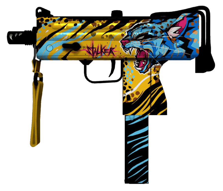 Il corpo della mitraglietta è dipinto di giallo e presenta un pattern animalistico di strisce diagonali e macchie in nero, bianco, blu e varie tonalità di marrone. Il punto focale del design è un'immagine blu e rosa della testa di un gatto selvatico. Sopra il grilletto, c'è un'iscrizione nero-rosa che recita "Stalker." Il caricatore è decorato con strisce diagonali blu, mentre la cinghia è gialla.