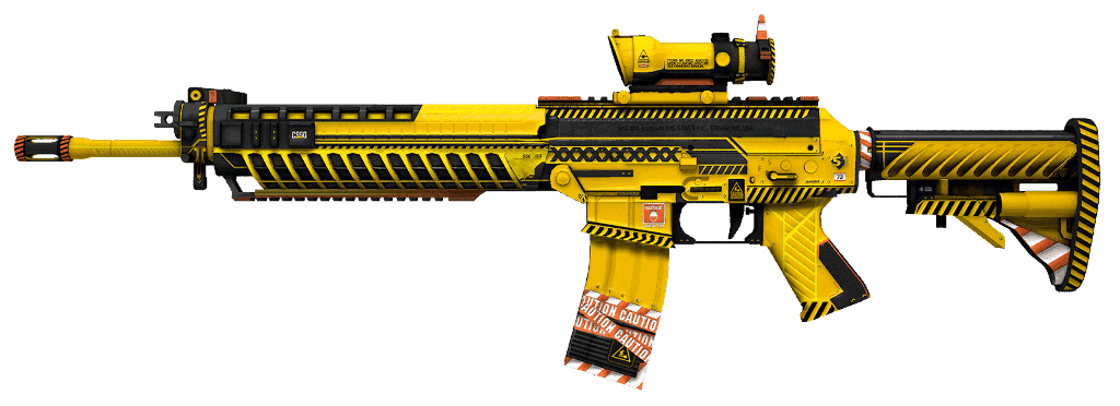 Il fucile mostra un vivace pattern geometrico composto da giallo e nero. Varie parti del corpo sono decorate con piccole icone e accenti che ricordano il nastro di avvertimento rosso e bianco, aggiungendo un elemento visivamente d'impatto al suo design.