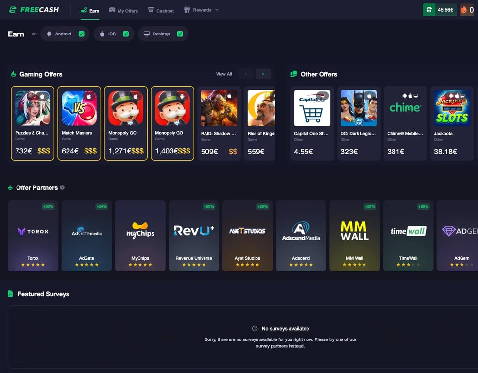 - Offerte Partner: Selezionando una delle nostre offerte partner apparirà un pop-up dove potrai vedere le offerte di gioco fornite dai nostri partner. Puoi iniziare e terminare queste offerte tramite Freecash.
