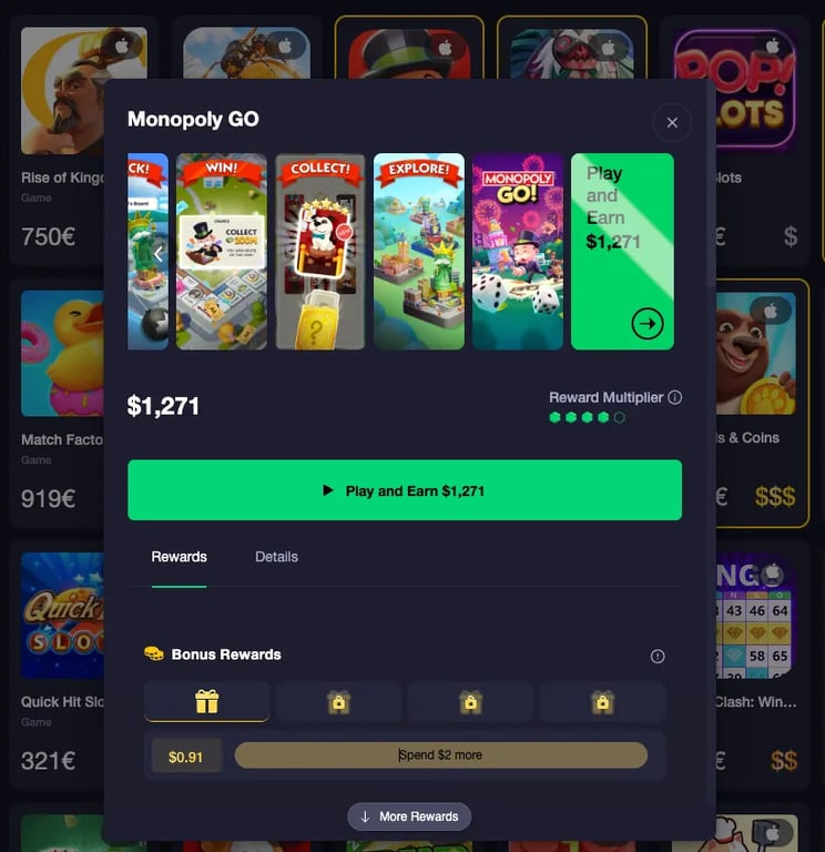Una volta trovato il gioco che vuoi provare, premilo per visualizzare questa finestra pop-up, e poi premi il pulsante verde "Gioca e Guadagna":