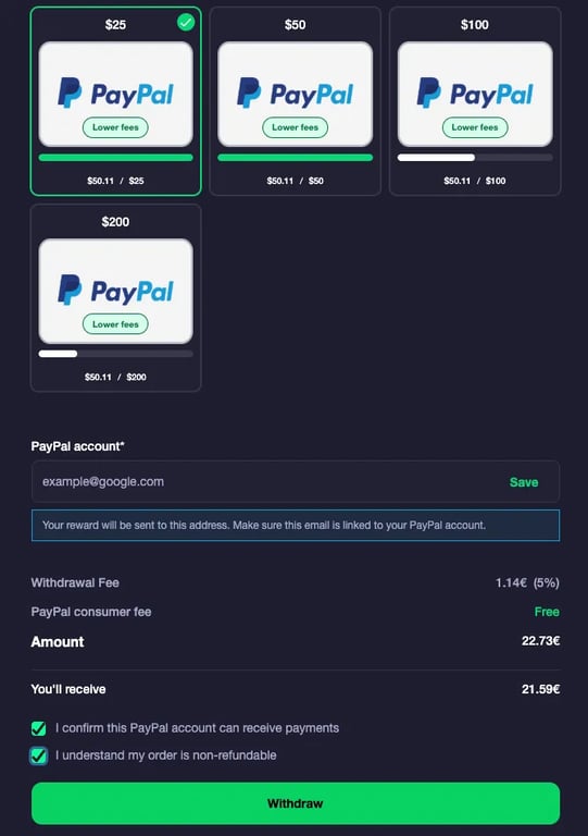 - Seleziona il metodo di prelievo che vuoi utilizzare (PayPal, buono regalo Amazon, Bitcoin ecc.)