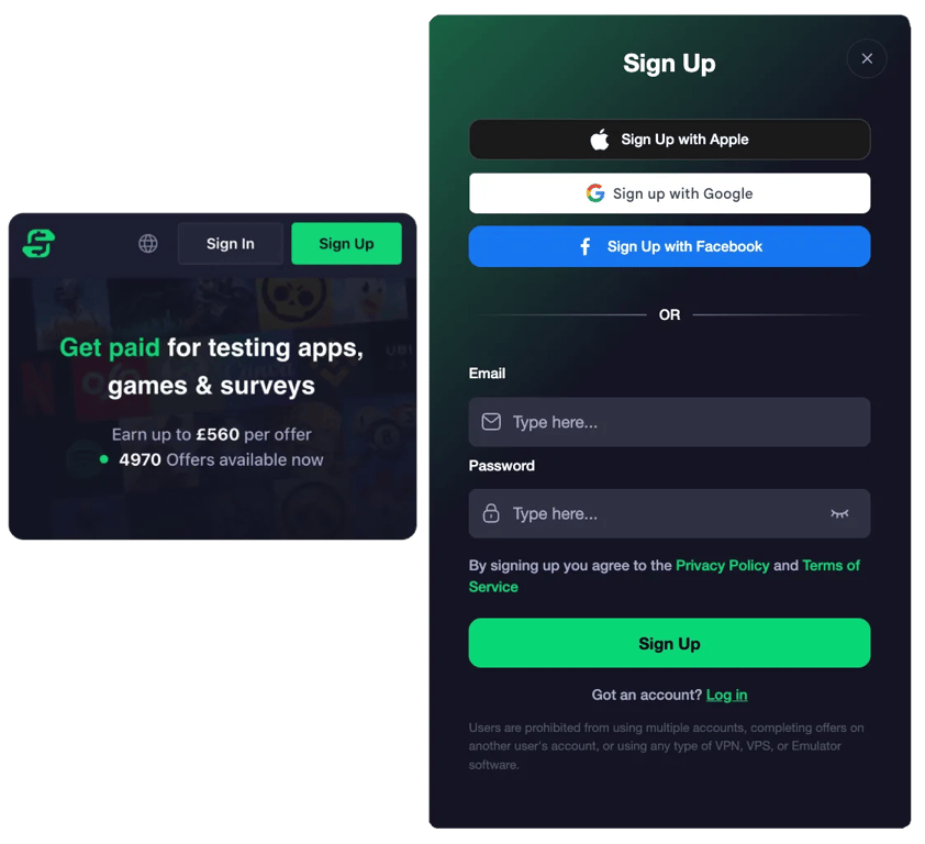 Ora che hai un account, puoi accedere a Freecash. Ma a seconda della tua regione, vedrai una delle due versioni di Freecash quando accedi per la prima volta: