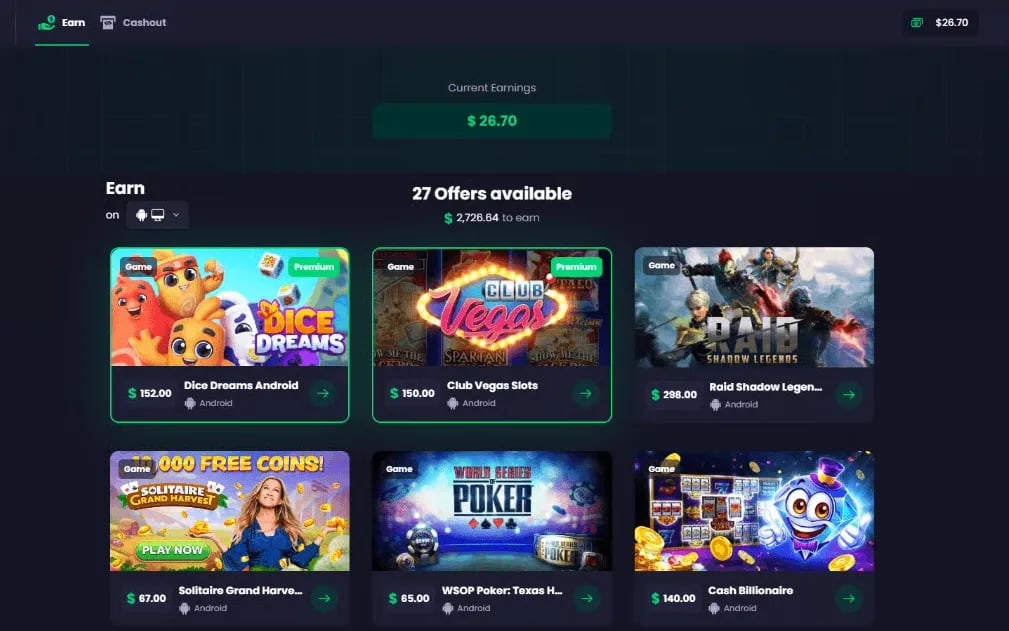 - Offerte di Gioco: Le nostre offerte di testing di giochi ti chiederanno di scaricare un gioco per mobile o PC, e poi completare gli obiettivi che ti proponiamo. Ad esempio, "Raggiungi il Livello 10 in 20 Giorni". Se sei in modalità Lite, queste sono le uniche offerte che puoi attualmente scegliere.