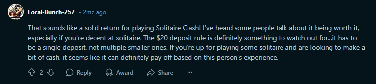 Ci sono però persone che hanno avuto un'esperienza negativa con Solitaire Clash, affermando che dopo un po' smettono di vincere, e che smettono di guadagnare dopo alcuni mesi di gioco. Io ho giocato solo per alcuni giorni, ma non ho avuto problemi nel continuare a ricevere ricompense. Comunque alterno tra giocare a Solitaire Clash e Freecash, dato che Freecash offre sempre ricompense per giocare, senza doversi preoccupare se sono legittime o meno, proprio come piace a noi italiani che siamo sempre attenti a non cascare in fregature online!
