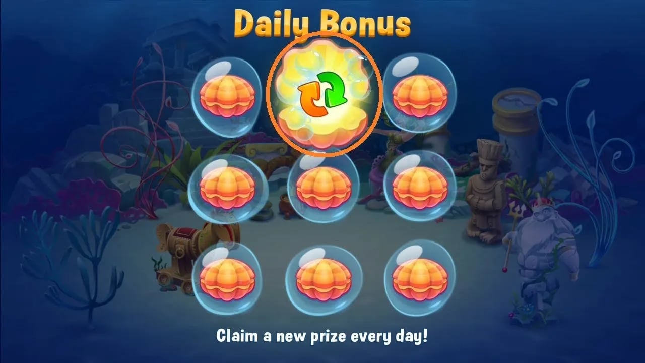레벨 8에 도달하면 일일 보너스가 해금됩니다. 이는 매일 처음 로그인할 때 아홉 개의 조개가 있는 팝업이 표시된다는 의미입니다. 조개 중 하나를 누르면 랜덤 보상을 획득하게 됩니다.