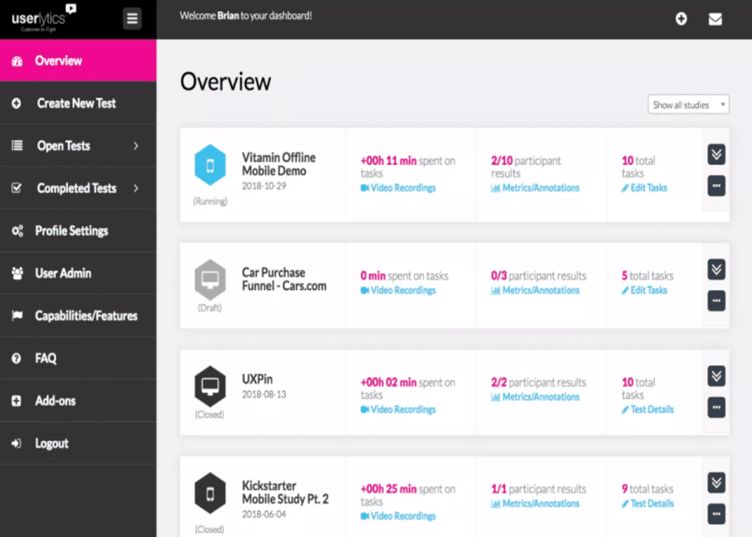 Userlytics bestaat al sinds 2009 en is een van de oudste platforms voor het testen van websites. In tegenstelling tot andere platforms heeft Userlytics specifieke vereisten, zoals een ingebouwde microfoon, Userlytics recorder software, en een webcam.