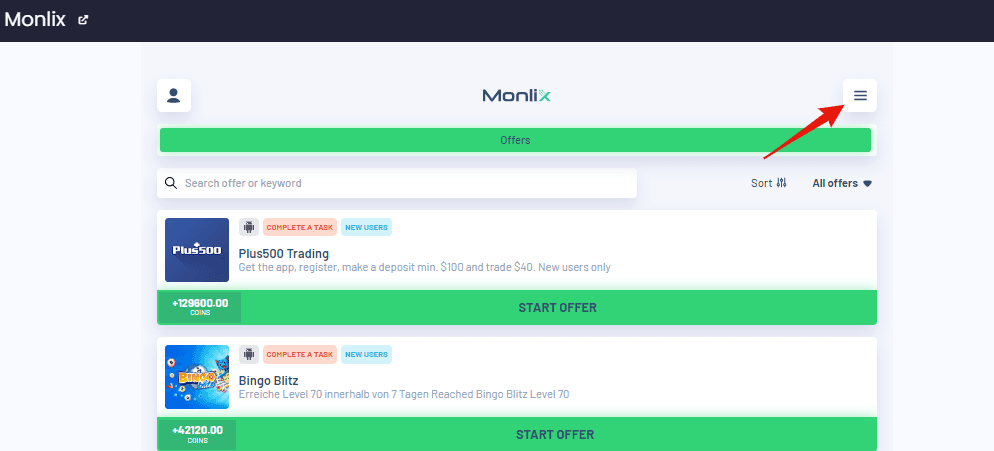 Om contact op te nemen met Monlix over een probleem met een Offer op hun Offerwall, ga je naar de Freecash Earn-pagina hier, scroll je naar beneden naar "Offer Partners" en open je hun Offerwall. Je kunt hun Offerwall ook openen door hier te klikken.