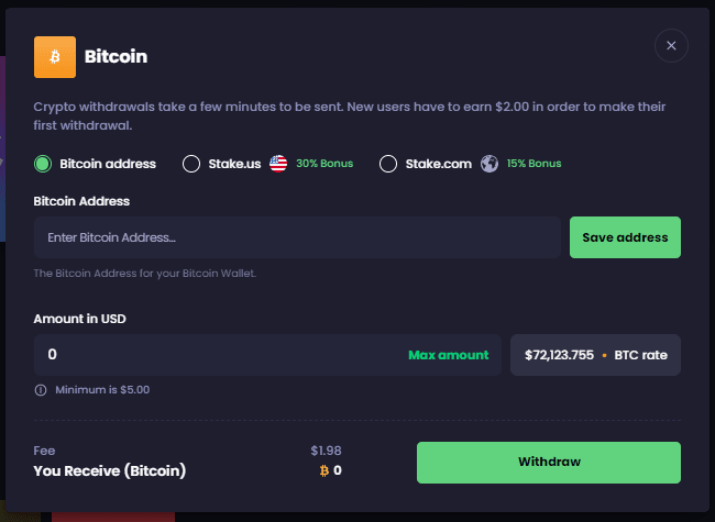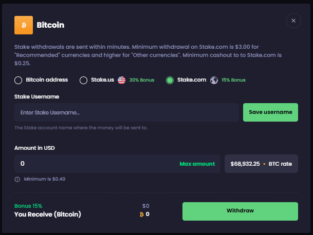 Let op: Stake opnames werken alleen met Stake.com. Zorg ervoor dat je de juiste versie van Stake selecteert voordat je opneemt. We kunnen niet helpen nadat je opname is verzonden, aangezien de betaling onomkeerbaar is.