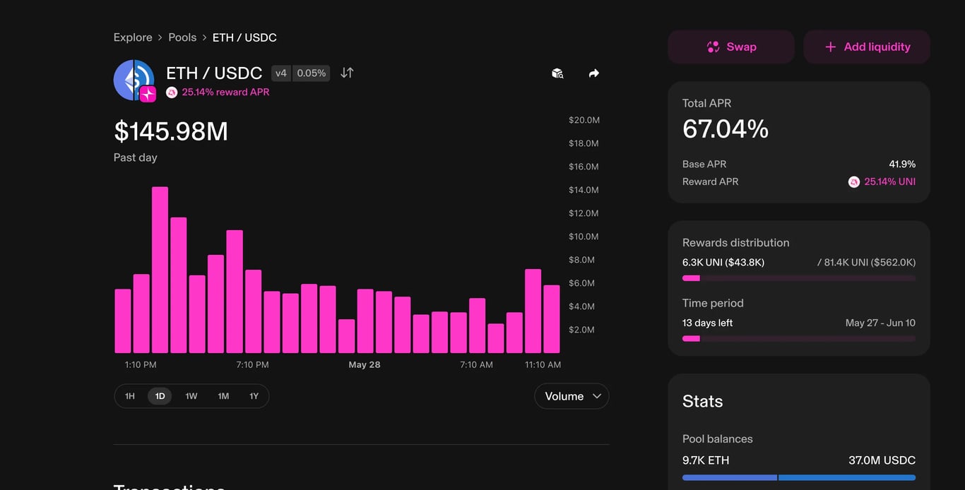Oto przykład dobrze działającej puli płynności (ETH/USDC), gdzie cała pula osiągnęła całkowity zwrot do 67% (z dodatkowym APR 25%), ze średnim dziennym zwrotem na poziomie 0,05% w momencie wykonania zrzutu ekranu.