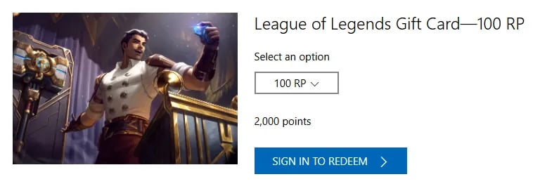 Możesz wykorzystać te punkty, aby otrzymać karty podarunkowe z RP. Haczyk? Potrzebujesz 2000 punktów Microsoft Rewards, aby kupić 100 RP, co oznacza konieczność wykonania 10 wyszukiwań w Bing przez 40 dni z rzędu.
