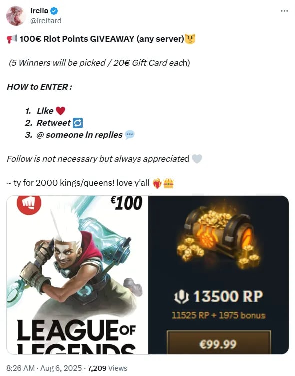 Setki początkujących streamerów LoL wykorzystuje konkursy z nagrodami w postaci RP do rozwijania swoich kanałów w mediach społecznościowych. Najlepszym źródłem do znalezienia takich konkursów jest X (Twitter).