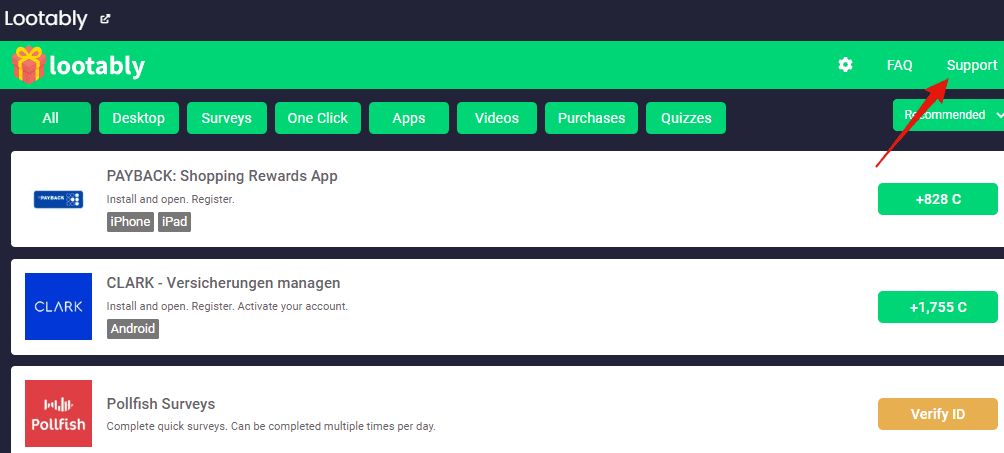 Aby skontaktować się z zespołem wsparcia Lootably, musisz przejść do zakładki "Support" w prawym górnym rogu offerwall, następnie skopiować swój identyfikator Lootably i wysłać zapytanie na adres [email protected] (pamiętaj, aby dołączyć swój identyfikator Lootably również w treści e-maila).
