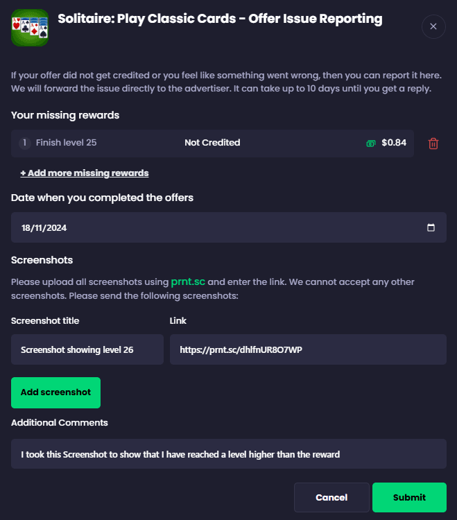 Tamamlanma tarihi, ilgili tüm ekran görüntüleri ve ek yorumlar gibi gerekli bilgileri doldurun.