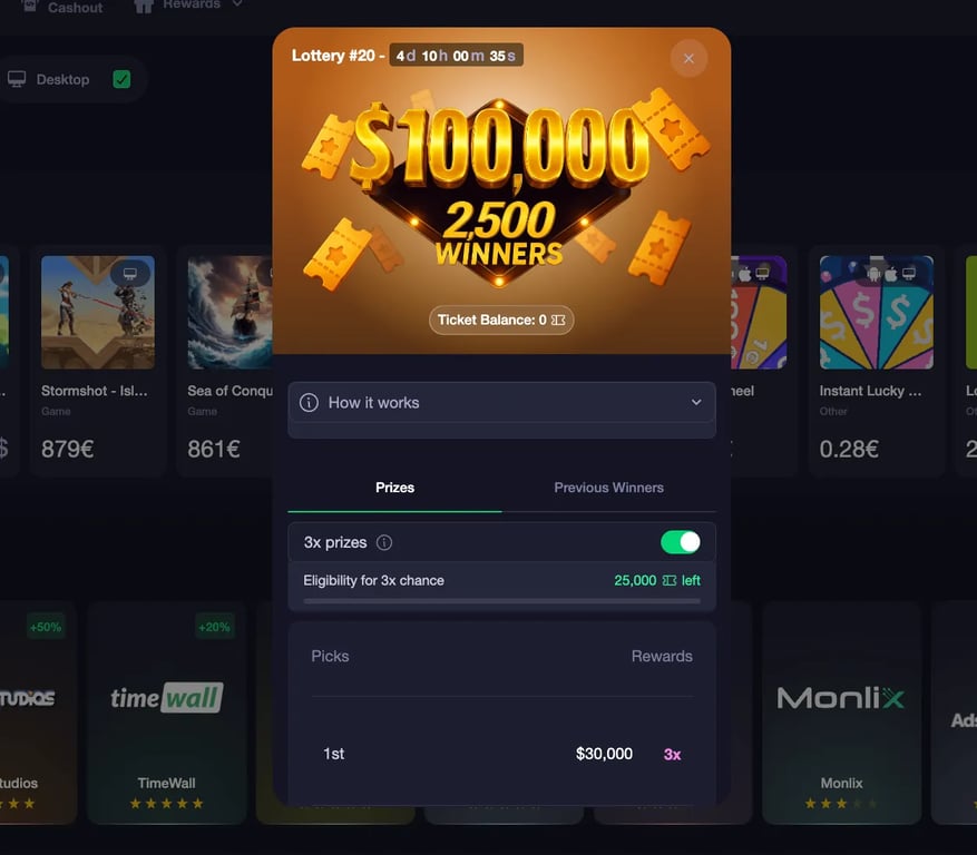 Freecash Haftalık Piyango ile her hafta 35.000$ ödül havuzundan pay kazanma şansı elde ediyorsun. Teklifleri tamamlayarak bilet kazan, bonus ödülleri bitirerek çarpanını artır ve büyük ödüller kazanma şansını yükselt.
